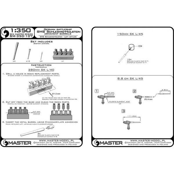 1/350 Schleswig-Holstein (1935) armament - 280mm (4pcs), 150mm (10pcs), 88mm (4pcs) barrels with resin mounts (for Trumpeter kit)